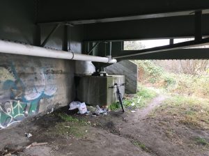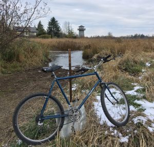 It’s November 5th and we all know what that means. It means I went on a bike ride in place of watching the Seahawks game. We had a cold strong wind from the North this morning so I just rode an out and back ride from Hovander. I parked in the Fragrance Garden parking lot at Tennant Lake and rode the dirt portion of the trail (see this route) down to Marietta. Very crisp but fun ride. The trolls had moved on from under the Slater Rd. bridge, but they did leave trash, graffiti, and a propeller. And I rode the 1981 Stumpjumper which is a perfect bike for this trail.