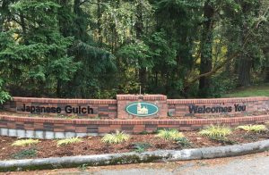 If you could look into that way back machine in my head, you’d see that I, and a few friends rode in an area of Mukilteo that we knew as “Jap Gulch” which was at that time just a large tree filled gulch with zillions of unmarked, often very steep and very muddy trails. Happily, as I drove by the lower end of the gulch, near the water, I could see a lot of trees and not a lot of houses. I also saw a trailhead…which had a sign mentioning that a portion of the lower trail was closed, but it was a trail and not buildings. So, I went around to the upper end of the gulch and was greeted with a big “impressive” sign.