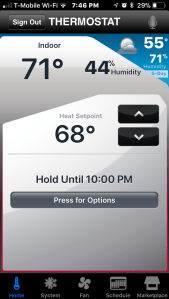 The new model has a color touch screen, worked right out of the box, had guided setup for 24/7 schedule. It’s also, as I mentioned above, wifi enabled which means a few things. It means that I can see not only indoor temps and humidity, but also and outdoor temps and humidity courtesy of some nearby weather station. It also means that there is an iPhone app that allows me to control every feature from my phone no matter where I am, as long as I have a cell signal and I keep paying Xfinity to keep my internet up. It also means that I can lower the heat from work if I realize that nobody will be home or raise it up for no reason at all. And one more feature that really applies to people like us who live in split level homes, the ability to have the whole house fan circulate the air to even out the upstairs/downstairs temp without pumping more heat into the house. This feature will also bring the cool air up from the basement during the summer to keep our house more livable without installing AC.
