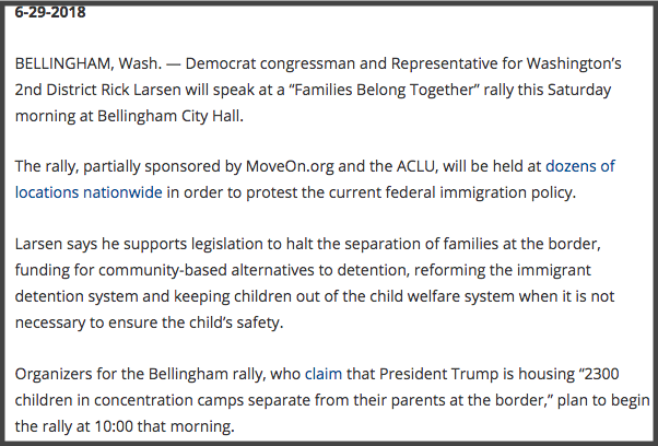 I read this KGMI post on Facebook today. The post mentions a claim that President Trump is housing children in concentration camps and says that Rick Larsen will speak about how families belong together at a local protest. I found this “news” item by KGMI to be both divisive and dehumanizing towards our President and in turn the roughly half of America which voted for him. I realize that KGMI is a business, and as so needs articles that drive web traffic to their site, however it is a sad commentary on Bellingham that KGMI feels they can make money promoting the dehumanization of fellow Americans by local politicians and national political groups.