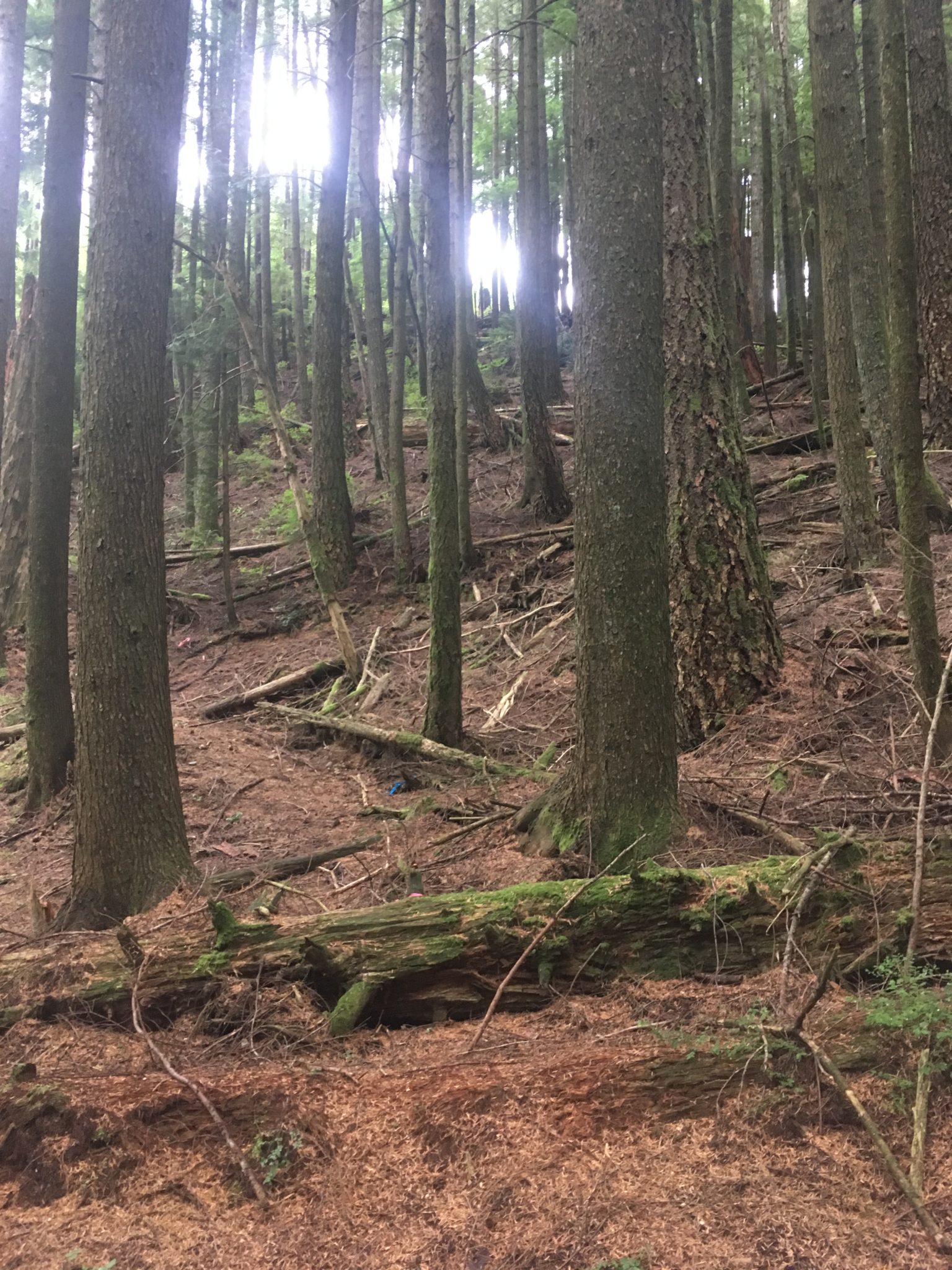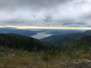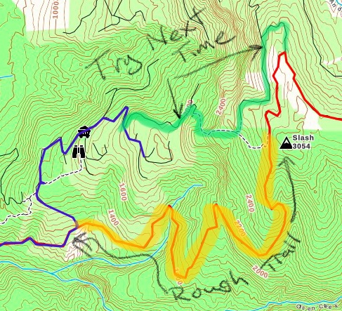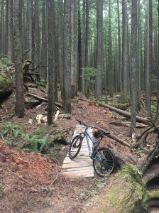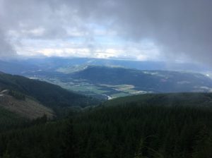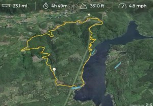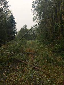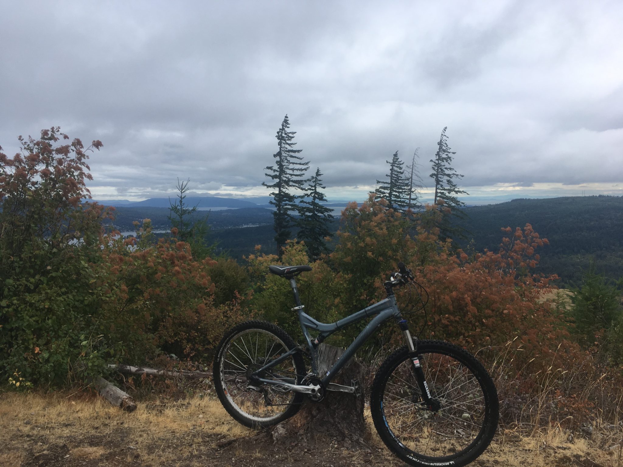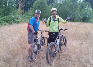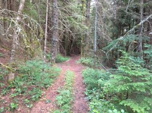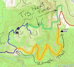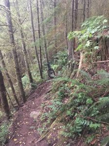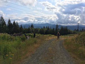 I’ve included, or will be including a couple of maps with this post as well as links to the route on giagps and Endomondo as you don’t really want to do this loop without navigational aids, you know, gps and map. We parked and began riding at the Forks, in Agate Bay thinking that ending our loop here with a beer made good sense. All three of us, on knobby tired mountain bikes, proceeded south along North Shore’s paved roadway and into the parking lot at the North Lake Whatcom Trailhead, about 3 miles. From there, at about 300 ft elevation, we took to the Chantrelle Trail and portions of the Wickersham before crossing the power line and then proceeding up to a 3000 ft peak that is not Stewart Mtn. I had been on this peak before and it wasn’t any easier to get there this time, but for this route reaching this peak meant that the seriously long climb was over. We then proceeded north, towards the real Stewart Mtn, along the ridge that separates Lake Whatcom from the Acme/Van Zandt valley. For the most part, the ridge is fairly open, but on the day we went there were areas where it was curiously cold, moist and green which was quite refreshing given our weather of late. Track wise, the ridge is mile after mile of winding gravel roads with lots of short ups and downs but no real overall elevation change. Our route reaches it’s northern most point just past a peak which was simply marked as Slash 3054 ft on our map. At this point, the obviously more well traveled road continues north while the route we chose had us taking a hard left pointing us almost directly south. We expected this gravel double track road to carry us all the way back down to Y-Rd, but in fact it did not. The road ended abruptly as it turned into a wide downhill creek bed/trail with all the big bowling ball rocks and logs you could want. It was also over grown in many areas making it difficult to see obstacles. On my old Frankenstein Stumpjumper with bouncy Judy forks, much of this trail was not rideable for me. The other guys with a new 29″ full suspension bike and a new 27.5 hardtail, both with big tires, didn’t look like they were having as much trouble as me. Next time I will ride something with a real suspension or find an alternate route that is the wide open gravel road we were expecting. On one of the images I penciled in an alternate route that looks like it will either have much less trail or maybe no trail. I plan to explore this alternate route from the Y-Road before doing the whole loop again. The rough trail did eventually connect with a gravel road and led us right out to Y-Road as planned. Back at the car and we didn’t need headlamps.