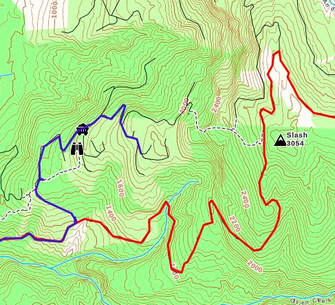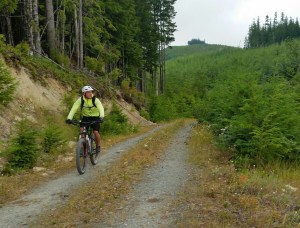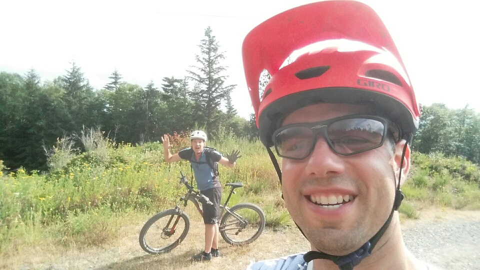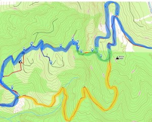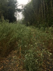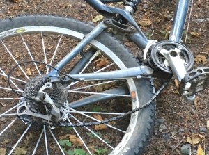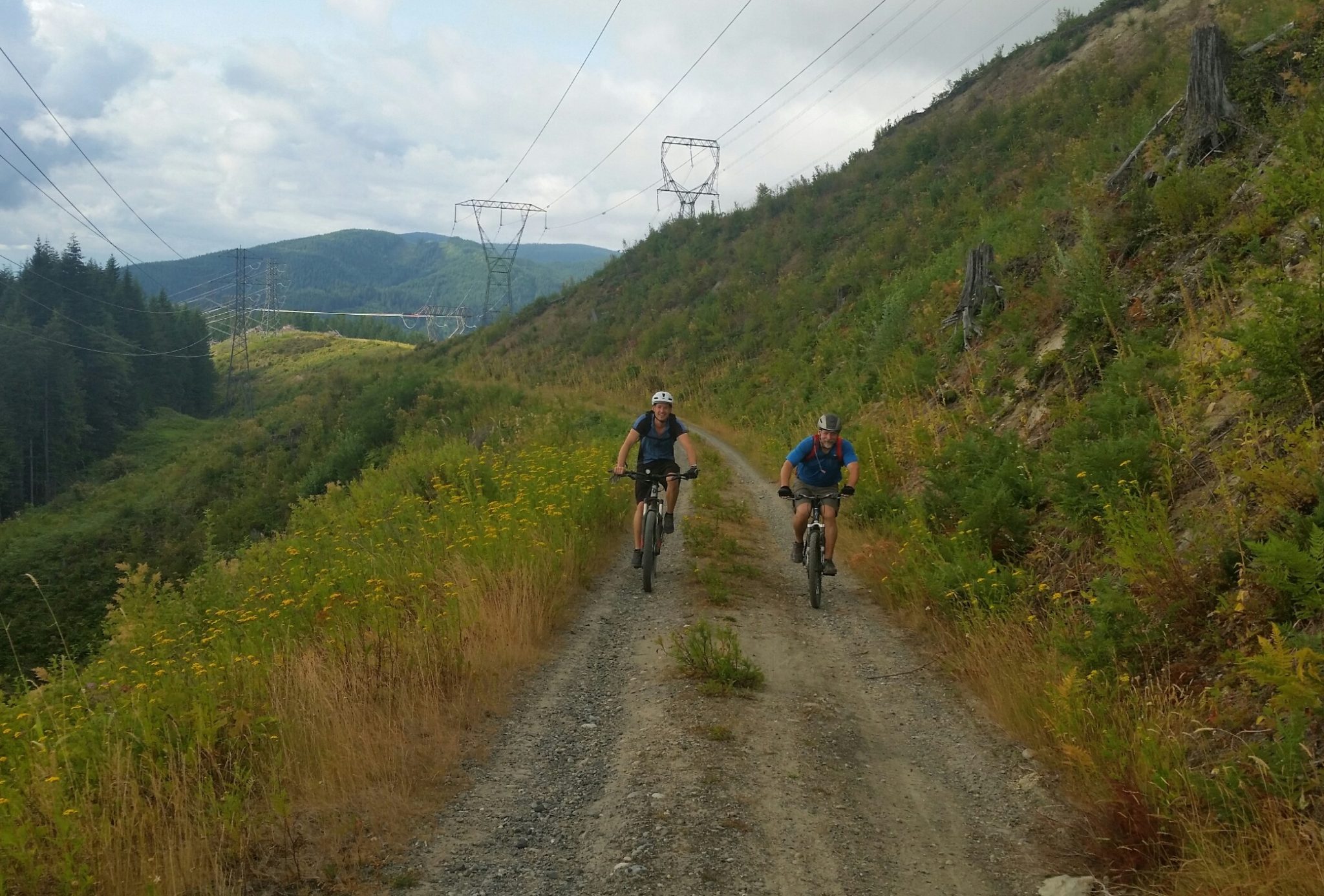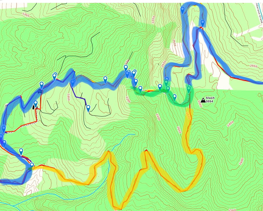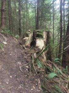 I’ve included, or will be including a couple of maps with this post as well as links to the route on giagps and Endomondo as you don’t really want to do this loop without navigational aids, you know, gps and map. We parked and began riding at the Forks, in Agate Bay thinking that ending our loop here with a beer made good sense. All three of us, on knobby tired mountain bikes, proceeded south along North Shore’s paved roadway and into the parking lot at the North Lake Whatcom Trailhead, about 3 miles. From there, at about 300 ft elevation, we took to the Chantrelle Trail and portions of the Wickersham before crossing the power line and then proceeding up to a 3000 ft peak that is not Stewart Mtn. I had been on this peak before and it wasn’t any easier to get there this time, but for this route reaching this peak meant that the seriously long climb was over. We then proceeded north, towards the real Stewart Mtn, along the ridge that separates Lake Whatcom from the Acme/Van Zandt valley. For the most part, the ridge is fairly open, but on the day we went there were areas where it was curiously cold, moist and green which was quite refreshing given our weather of late. Track wise, the ridge is mile after mile of winding gravel roads with lots of short ups and downs but no real overall elevation change. Our route reaches it’s northern most point just past a peak which was simply marked as Slash 3054 ft on our map. At this point, the obviously more well traveled road continues north while the route we chose had us taking a hard left pointing us almost directly south. We expected this gravel double track road to carry us all the way back down to Y-Rd, but in fact it did not. The road ended abruptly as it turned into a wide downhill creek bed/trail with all the big bowling ball rocks and logs you could want. It was also over grown in many areas making it difficult to see obstacles. On my old Frankenstein Stumpjumper with bouncy Judy forks, much of this trail was not rideable for me. The other guys with a new 29″ full suspension bike and a new 27.5 hardtail, both with big tires, didn’t look like they were having as much trouble as me. Next time I will ride something with a real suspension or find an alternate route that is the wide open gravel road we were expecting. On one of the images I penciled in an alternate route that looks like it will either have much less trail or maybe no trail. I plan to explore this alternate route from the Y-Road before doing the whole loop again. The rough trail did eventually connect with a gravel road and led us right out to Y-Road as planned. Back at the car and we didn’t need headlamps.