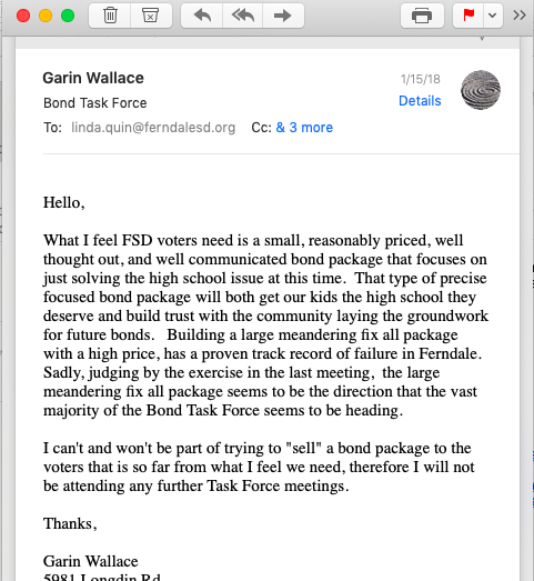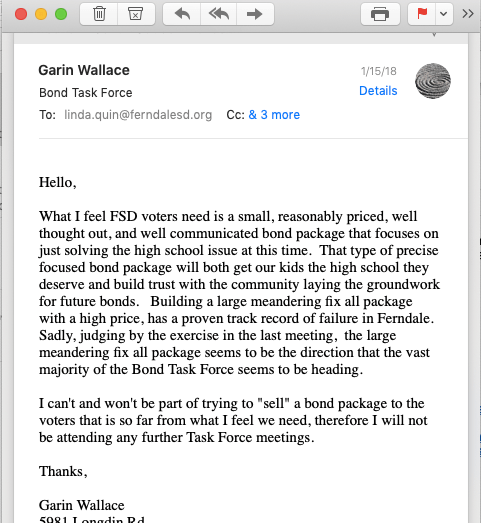 Oh, FYI, here is a copy of the letter from a year ago when I quit participating in the Bond Task Force. I later had some minor participation helping to choose members of the potential Oversight Committee.