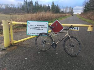 I parked at the Birch Bay Waterslides then rode down the hill towards Birch Bay, turning left onto Birch Bay Drive, then riding around the bay and through the state park. From Birch Bay State Park I rode up the hill on Pt. Whitehorn Road crossing Grandview and coming upon the first gate. This gate signage on Grandview spells out that it is ok with BP to walk and bike on their private property during daytime hours.