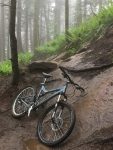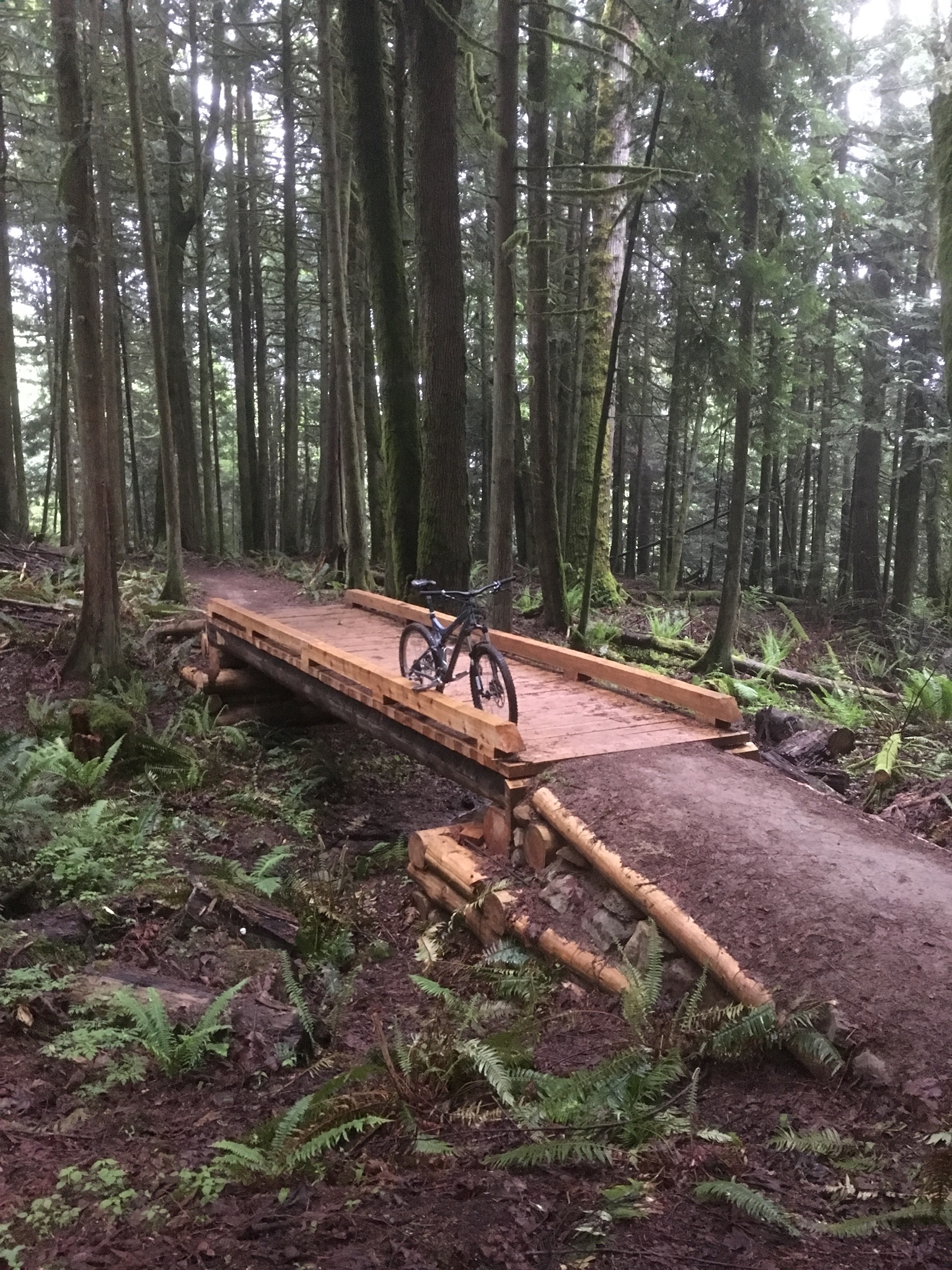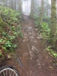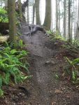 I guess Rufus is meant to be a climbing approach to the downhill only Cougar Ridge Trail. I am pretty sure that Rufus is an easy Green rated trail while Cougar has either Blue or Black rating, depending on which path you take on the way down, more on that later. Rufus is a mostly wide open well groomed trail with few obstacle, mostly small roots and rocks. And as a climbing trail the grade is steady and consistent while not too steep after you leave the lower part of the trail. There were a few places I couldn’t ride, but it was pretty wet on the weekend that I went. The trail also has a forest coolness factor that you just don’t find on the Galbraith trails which feel a lot more artificial and manmade, maybe because Rufus cuts through protected forest that hasn’t been logged recently, while the Galbraith side is a working forest where you have to check the logging/spraying report like a weather report. Rufus does have a few manmade items like a bridge, a bench, a fence or two and even a few berms, just not enough manmade stuff to feel too manmade.