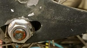 I don’t tend to ride bikes that I haven’t safety checked. So I did a little Googling to see what I was working with. I figured that with the 4 bar top tube, it wouldn’t take too long to figure out what bike I had under the paint. Looking around the internet, first for visuals, the rear drop out was unique as well as the top bar. The drop out looked like many Murray bikes from the 1960’s, then looking at the top bar it only took a second before I narrowed my search to a series of Spaceliner bikes that Murray made for Sears around that time frames. This was beginning to be interesting, because owning a vintage bike with spacey gas tank or rockets was on my bike buck list. I found the serial number on that long, fairly long distinct rear drop out and after finding this forum page I quickly determined exactly what bike i was working with. Serial number 502 46901 0302353 belonged to a 1964-65 Sears Spaceliner bike, a bike that originally was all chrome, with a springer fork, and numerous accessories like gas tank, horn, tail light, rack and various reflectors. Whew, it wasn’t a whim bike, it was a bucket list bike ;).