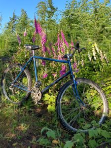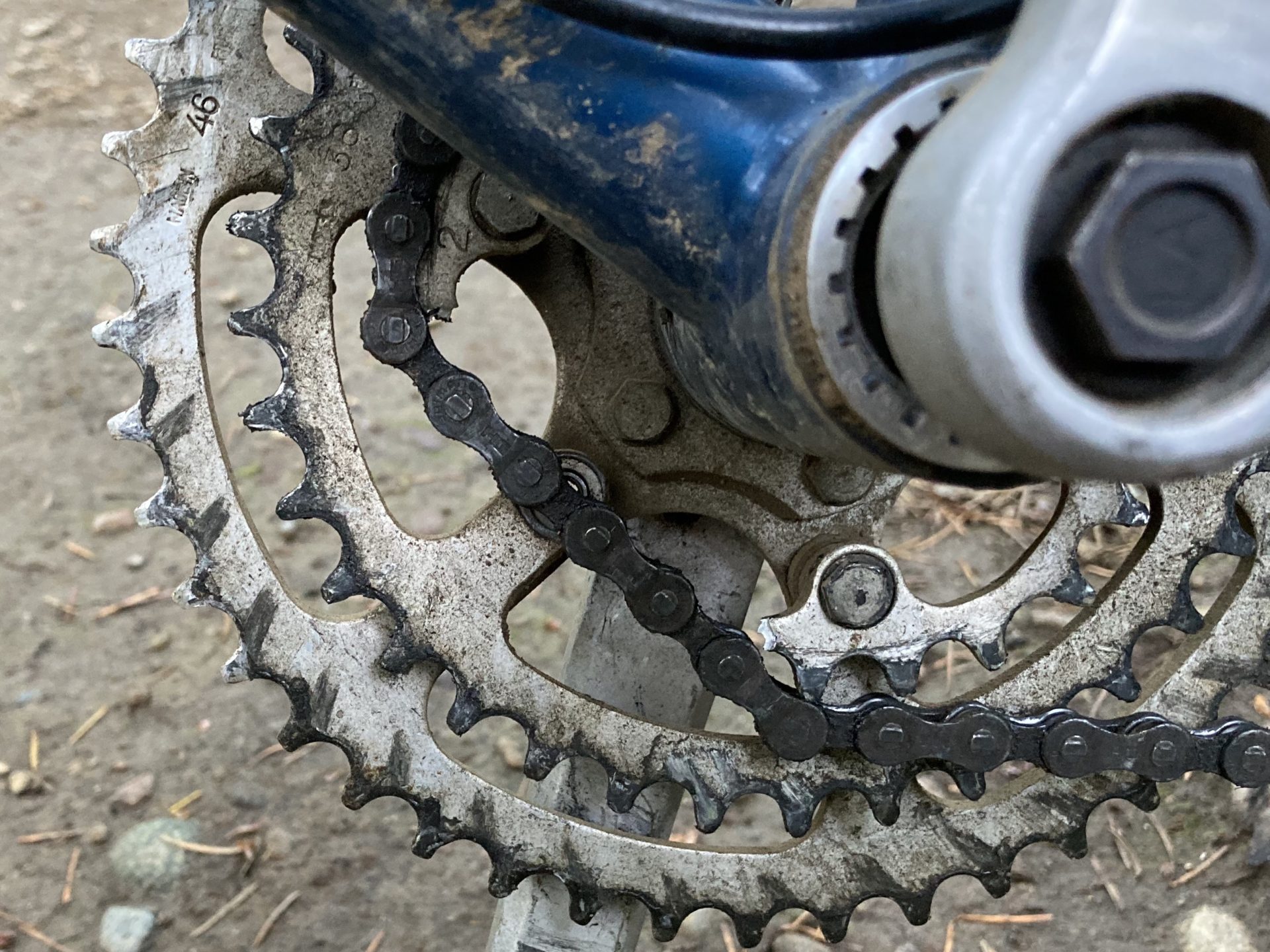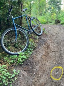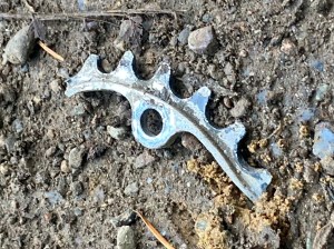 This year’s Stumpjumper Day also had an uncool old issue surface on the first little uphill section. A broken inner chainring, a complete first for me in my life! I go for a little hard press on my leg to lift the rigid front end over a little bitty bump and wham, chains off and I have a new bruise on my knee. My thought was that the front derailleur was out of adjustment allowing the chain to just drop off, so I jogged up to the top of the hill, shifted to the middle ring to get the chain back on and off I went riding up the Dog Patch Trail. It wasn’t until I stopped at the top of the trail to adjust the derailleur that I realized I had a bit more than just an adjustment issue. I had a broken chainring, an old bike issue. I also had a vintage crankset that had all 3 chainrings held by the same set of bolts, of which, now half of them were damaged or missing. I felt lucky to have just climbed a section of trail on the middle ring without any more old issues.