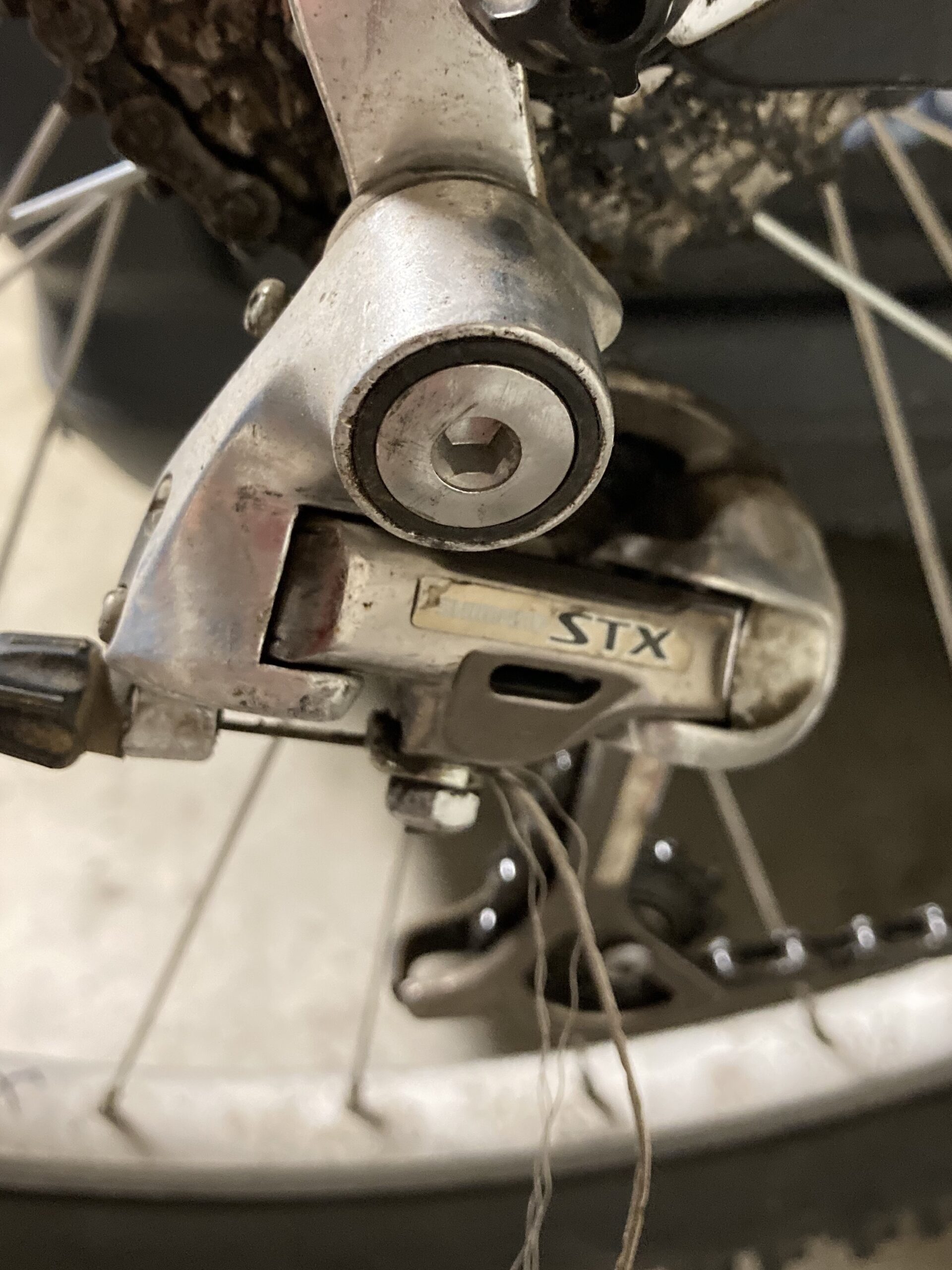Back to positiives. Cool shiny retro seat; who does that? Avid V-brake and levers are really good for the mostly non-disc bike era; perhaps better than their Shimano peers. The bike is almost completely stock and has held up well for it’s age given that the previous owner said that he had ridden it a lot; I’m guessing that they weren’t hard miles on the rear suspension since there was a rack attached back there that essentially locked out rear swing arm action. The only non-stock items seemed to be the tires and the right side shift lever. The tires were age cracked and now have been replaced by Schwalbe Black Jacks (cheap). I’ve got an Ebay order coming for a new right side shifter because I wanted them to be stock, as well as I wanted the shifter to not be an 8-speed shifter mated to a 7 speed cassette; we don’t need to be confused by empty clicks.