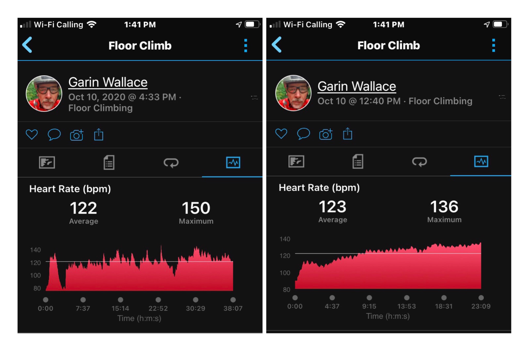 This year, subjectively, I was feeling pretty good as I got going on my 61 flights; Objectively, I glanced at my Garmin heart rate number at the top and bottom of each flight for the first little while, then here and there for the rest of the flights because my heart rate was feeling pretty darn stable. Up a few bpm on the up steps and then down a few bpm on the down steps.