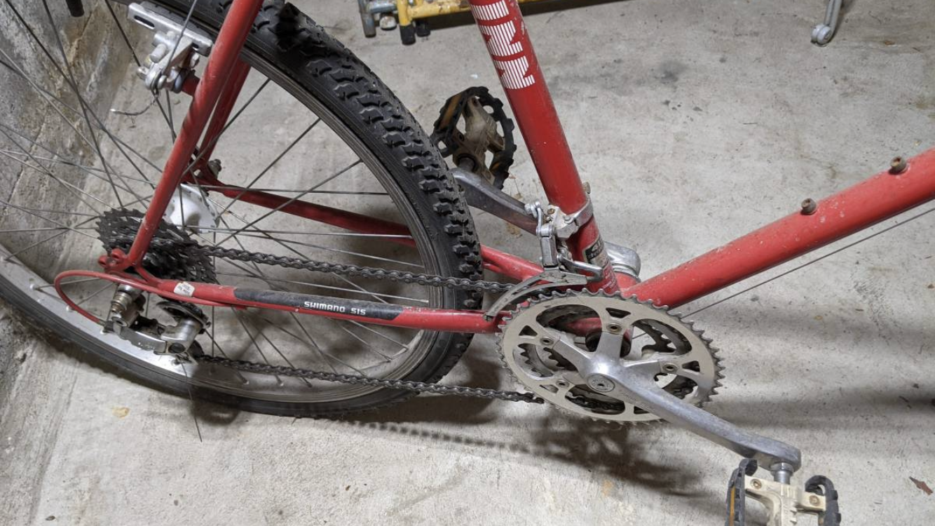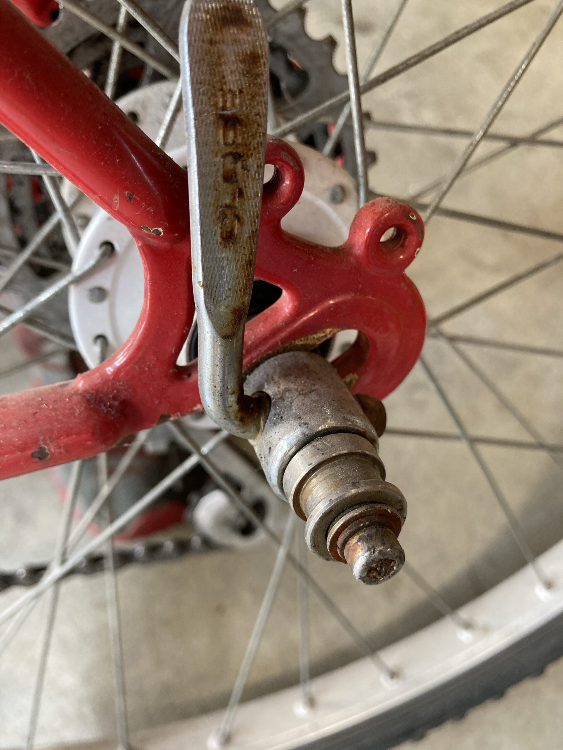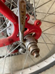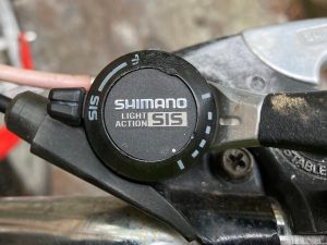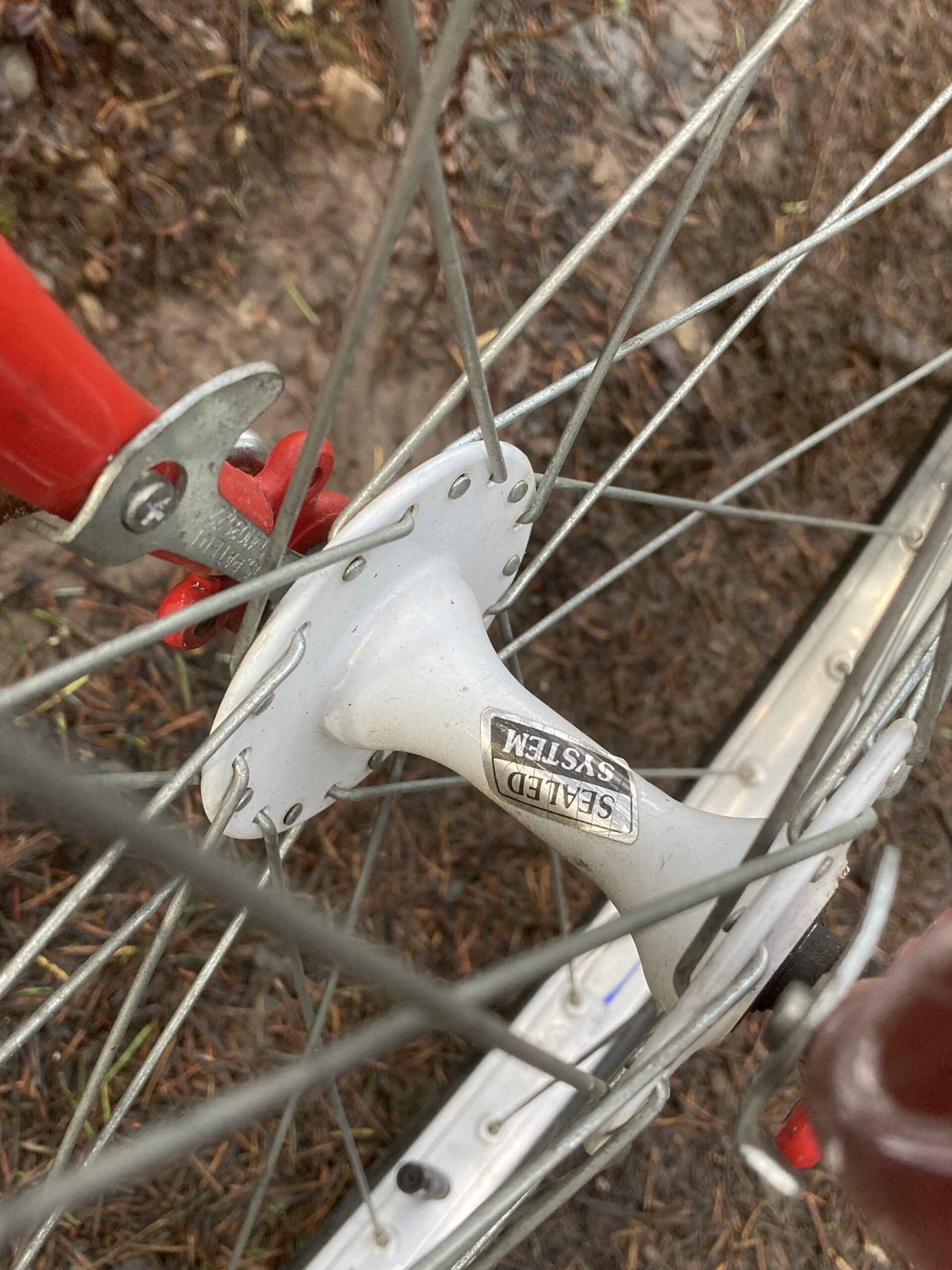 I also noticed weird white hubs, but they were large flange and had stickers saying that they were sealed bearing; also good. I also began to really take notice of how very little wear there was for a 35 year old bike…the stickers were not only there, they were easily readable and the rims, sprockets, etc were just dirty, not worn. Another time niched thing I noticed was that the shifters were right at that transition between friction and index shifting. The front derailleur was strictly friction which I actually like because it can be “trimmed” on the fly to eliminate chain rub. The rear derailleur was changed by a thumb-shifter which could be switched between indexed (SIS) and friction. Tires were flat, so I got new tubes. Tires were also Bell Dirtsters for which I have no witty naming remarks, just a head shake…what were they thinking?