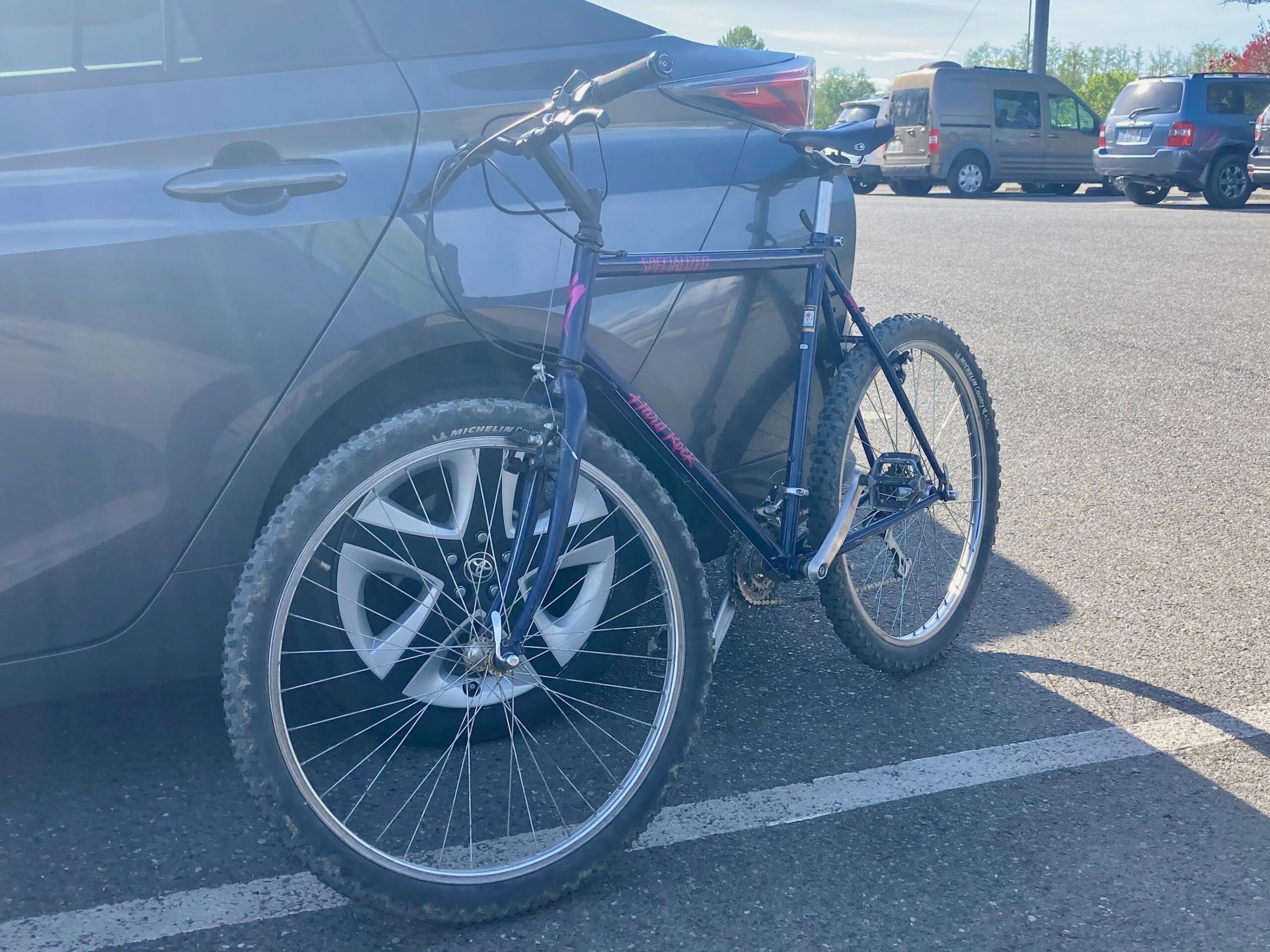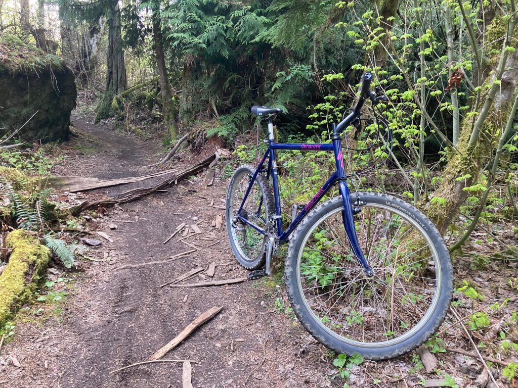 I cautiously took it on a 10 mile flat path gravel ride without problems, so the next day I hit a few real trails where I found out all of the mistakes I made like realizing that I put the smaller chainring on when the crankset was on the Stumpjumper and now that it is back on the Hardrock the front derailleur cage hits the rear stay so no granny climbing gears. I also realized that the narrow stock handlebars transmit a lot of shock back through the ridged front end right into my neck, where I still have a headache. I compensated by airing down the tires and had a fun nostalgia ride around the lowlands of Galbraith. I’ll make a few fixes and try this again. Glad I didn’t throw all this “old crap” away.