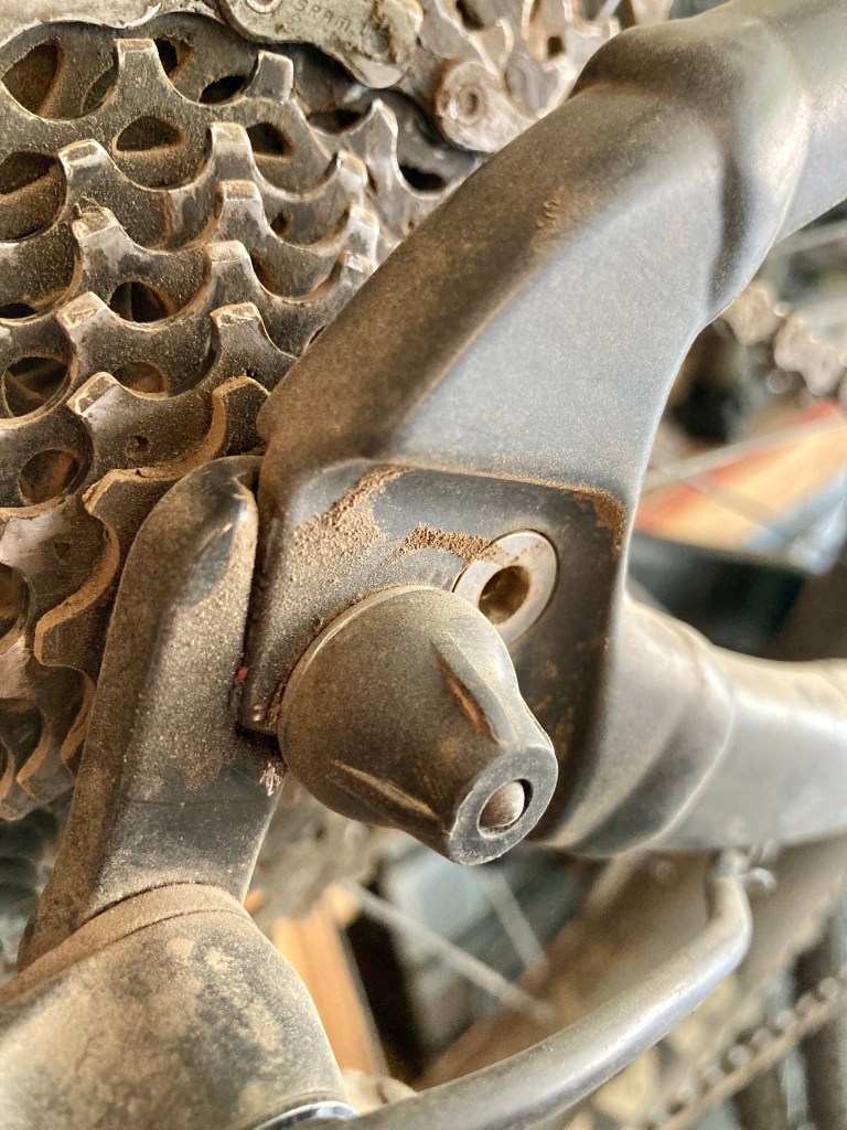 Then I found it. Press on rear derailleur and I get my creak but when I press on rear stay; no creak! Back to the dropout and I theorized that even though it is clean and tight, maybe it was rotating on the single attachment bolt because the dropout and the frame don’t match perfectly. Frustrated and only having red Loctite, I Loctited the hanger to the frame, not the bolt, just the flat of the hanger to the flat of the frame and tightened the quick release skewer. I would have preferred trying some of the remains pliable blue stuff, but I didn’t have any and as I said I was frustrated. Any way, 4-5 rides later and I’ve had no return of the creak and the rear end feels rigid as it should.